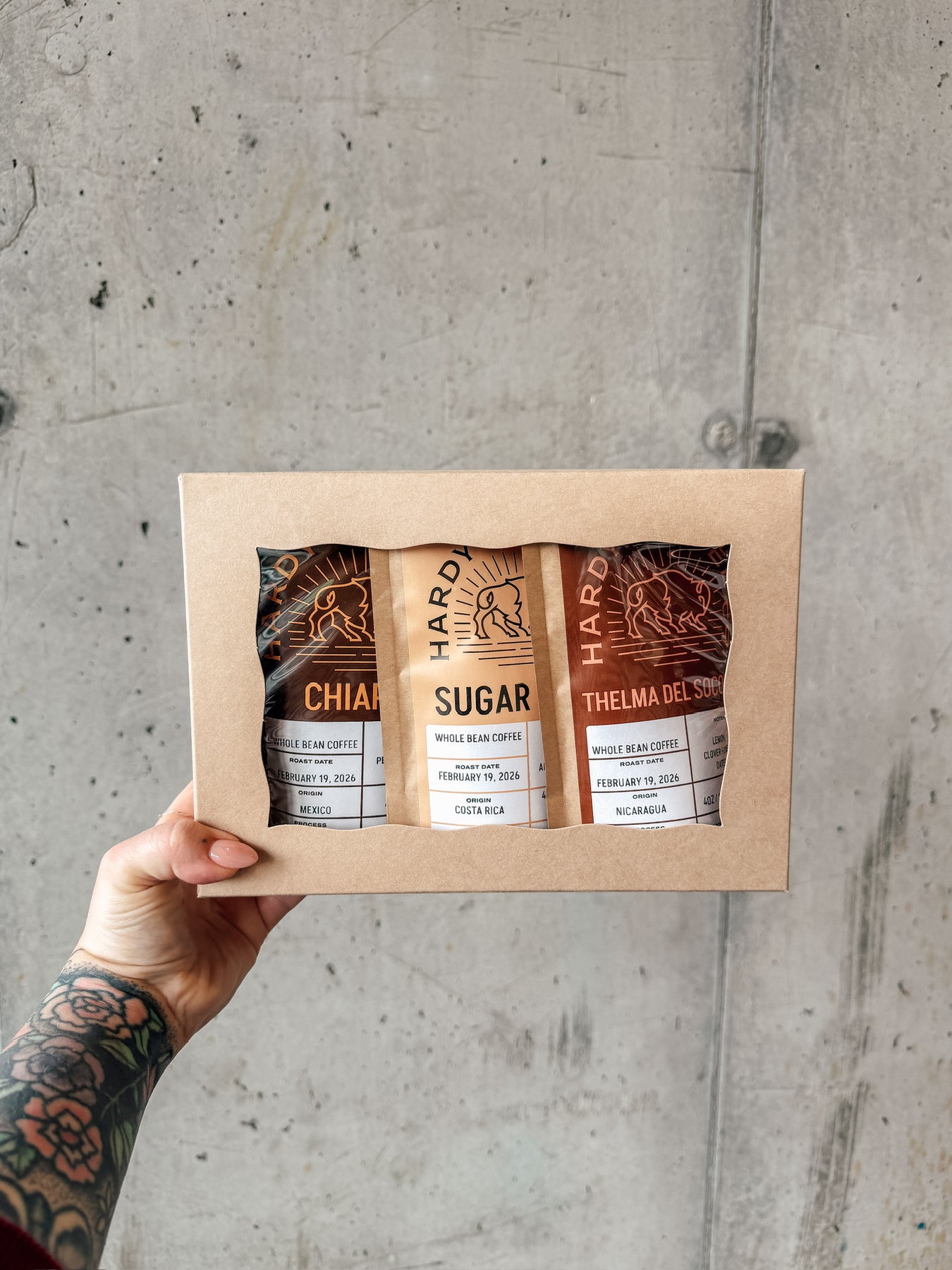 This Single Origin Sampler is a perfect gift for the coffee lover in your life. Each box is carefully curated with (3) 4oz. bags of freshly roasted coffee and crinkle paper.